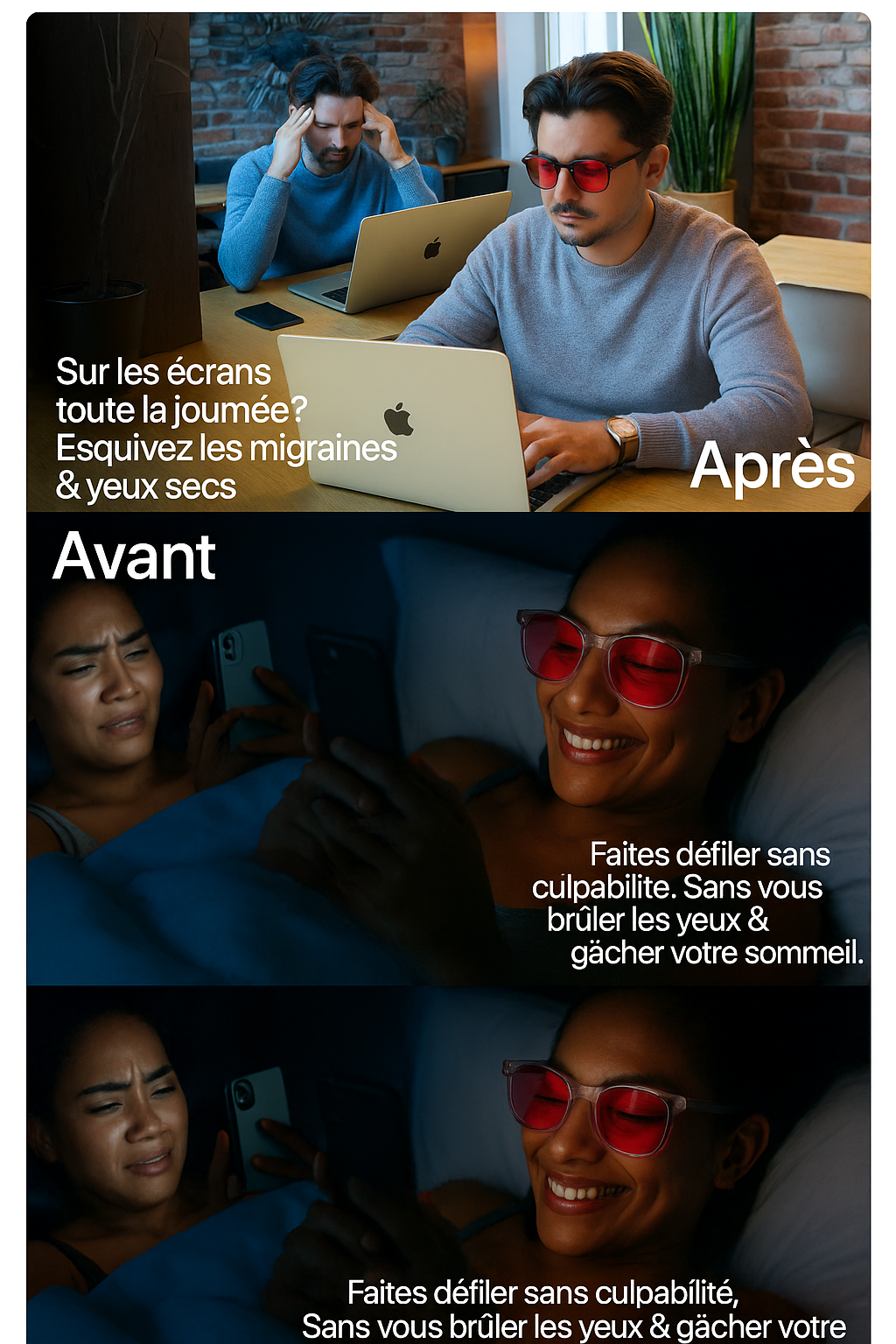🔴Rouges (soir) : bloquent ~99 % de la lumière bleue & verte (400–520 nm) pour favoriser la mélatonine et un sommeil profond.