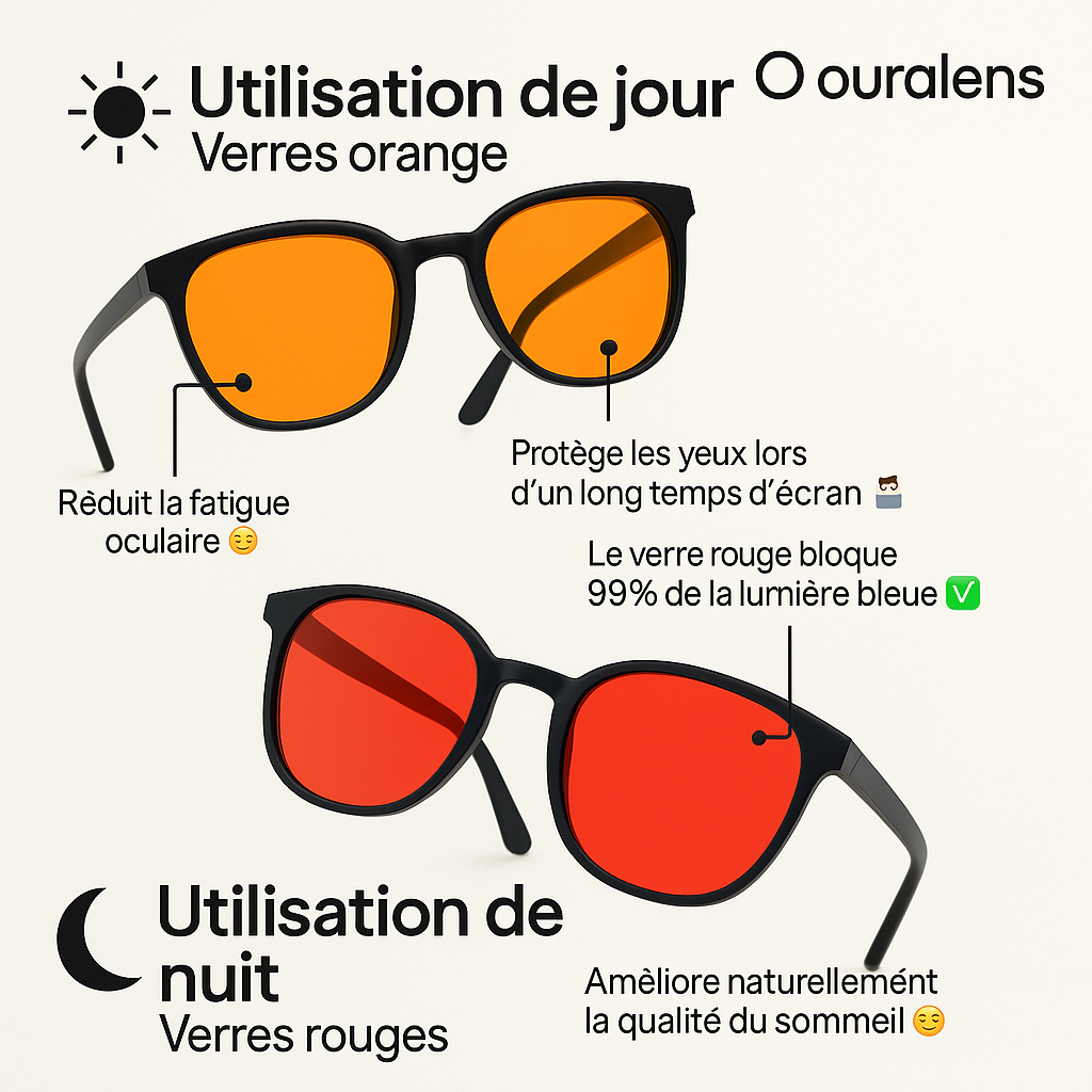🟧Oranges (jour) : filtrent fortement la lumière bleue tout en préservant les couleurs, pour réduire la fatigue et booster la concentration..